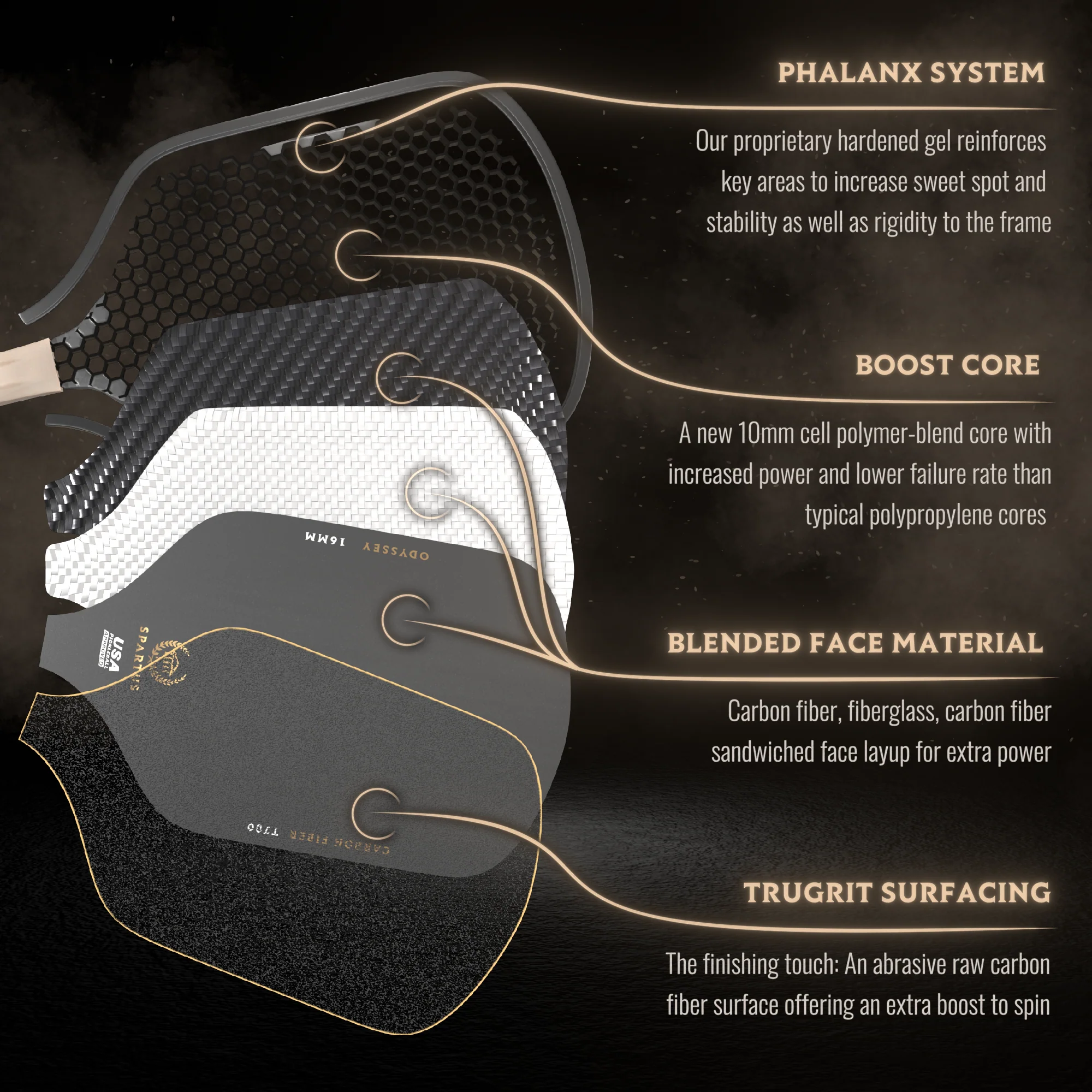 Phalanx System™: Our proprietary hardened gel reinforces key areas to increase sweet spot and stability as well as rigidity to the frame